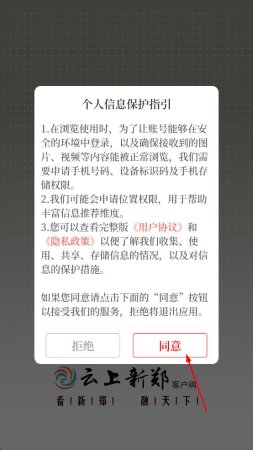 1、打开云上新郑,在弹出的个人信息保护指引页面,点击同意,进入云上新郑首页。