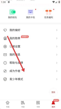 2、在我的页面中,向下滑动找到并点击成为作者选项。