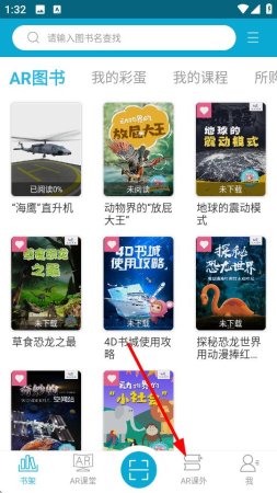 1、打开4D书城应用,点击底部导航栏中的AR课外选项,进入课外图书页面。