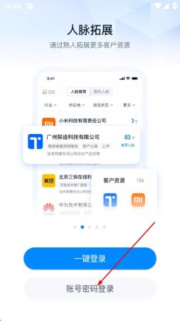 1、打开探迹APP,在人脉拓展页面,点击账号密码登录。