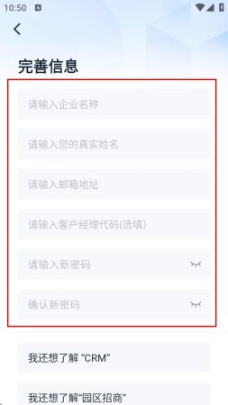 4、进入完善信息页面,依次输入企业名称、真实姓名、邮箱地址,可选择填写客户经理代码,再设置新密码并确认新密码。
