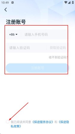 3、在注册账号页面,输入手机号,填入验证码,勾选我已阅读并同意探迹服务协议和探迹隐私政策,点击注册账号。