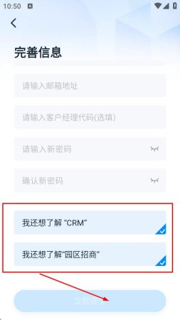 5、根据自身需求,勾选我还想了解‘CRM、我还想了解园区招商’等选项,点击立即提交,完成账号注册。