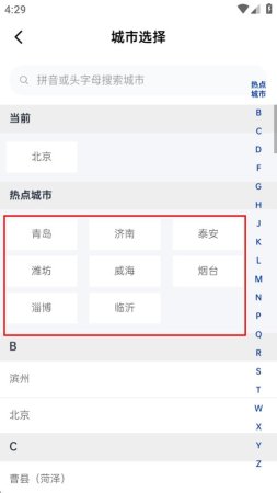 2、进入城市选择页面,选择目标城市。