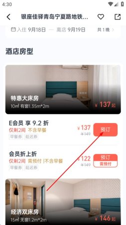 7、在酒店房型页面,点击房型右侧的预订按钮。