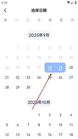 4、进入日期选择页面,选择入住和离店日期。