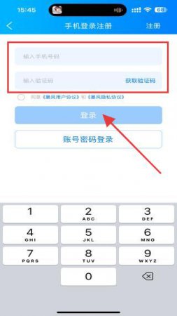 3、在手机登录注册的页面内,输入手机号与验证码,再点击登录的按钮。
