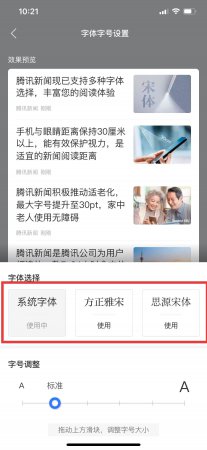 3、在字号调整区域,拖动滑块左右移动,即可调整字体大小,左侧A小代表缩小字号,右侧A大代表放大字号。
