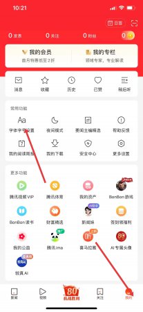 1、打开腾讯新闻APP,进入我的,在常用功能里点击字体字号设置。
