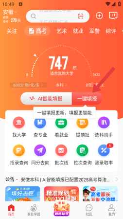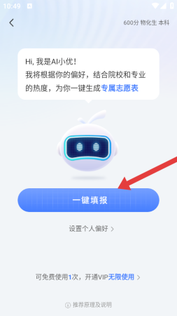 1、在优志愿的首页,点击一键填报的按钮,进入AI志愿生成的界面。