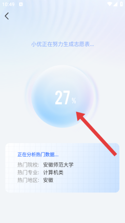 3、等待系统加载,页面显示小优正在努力生成志愿表...及进度,同时可查看热门院校、专业等数据。