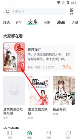 1、打开熊猫看书APP,点击底部书城,在女生等分类下找到想阅读的书籍,如春茂侯门。