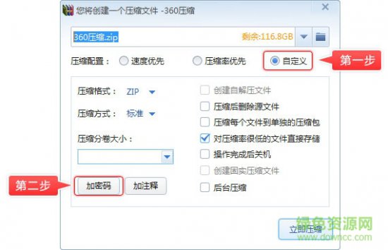 2.进入到创建压缩文件界面,我们在压缩配置选项中点击“自定义”,然后在界面下方就可以看到有“加注释”选项,我们点击进行下一步。