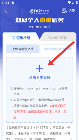 2、在知网个人查重服务页面,点击上传文档区域,选择待检测的文档,按照提示完成文件上传操作。