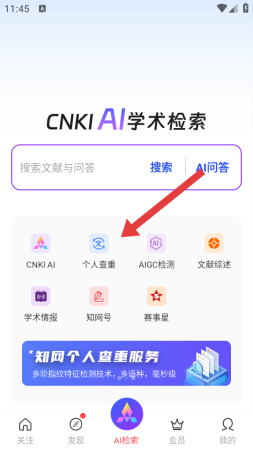 1、打开手机知网APP,进入AI检索页面,点击个人查重选项,这是进入查重服务的关键入口,确保准确找到对应功能。