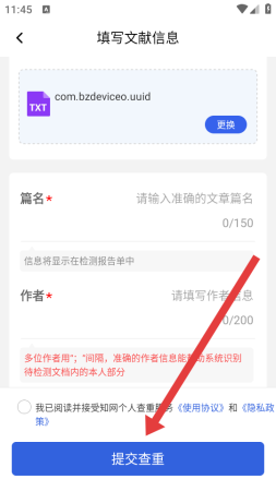 3、填写文献信息,包括篇名、作者等必填项,勾选接受使用协议和隐私政策后,点击提交查重按钮,完成查重申请。