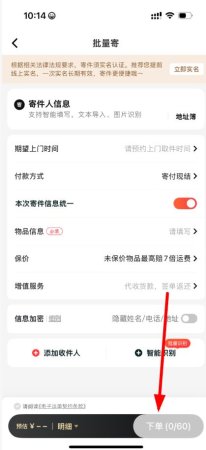 3、在批量寄件页面,填写寄件人信息、期望上门时间等相关信息,确认信息无误后点击底部下单按钮即可完成批量寄件下单。