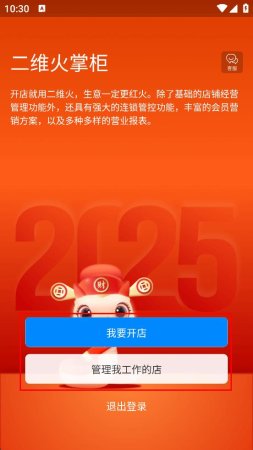 4、注册成功后,进入二维火掌柜主页面,可根据需求选择“我要开店”或“管理我工作的店”,开启后续的店铺相关操作。