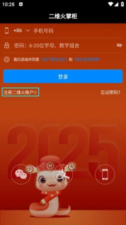 1、打开二维火掌柜软件,进入登录页面后,点击“注册二维火账户”选项,进入注册二维火账户页面。