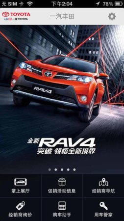 一汽丰田是由丰田官方推出的服务应用平台,强大的掌上展厅功能方便您了解一汽丰田旗下各款车型(皇冠、锐志、卡罗拉、花冠 EX、威驰、RAV4、普拉多、兰德酷路泽、普锐斯、柯斯达、丰田86、普瑞维亚、普拉多2.7等)的详细配置、优惠价格、促销活动等一切您需要的信息,更为您提供便捷的经销商位置查询和一键拨叫功能,让您的购车更舒心、更实惠。丰富的用车管家服务功能,为您提供更贴心、便利、实用的行车辅助。