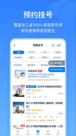 浙江预约挂号iOS版是浙江省医院统一预约治疗服务平台的移动客户端软件。可为浙江省二级及以上医院提供医院、科室、医生信息查询、实时预约登记、排队和电话号码查询、检查报告查询等诊疗服务。