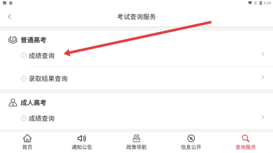 2、在考试查询服务页面中,点击普通高考下的成绩查询按钮,开始查询成绩。