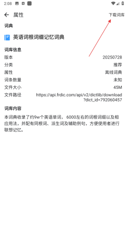 4、在目标词典的属性详情页面,点击右上角下载词库按钮。