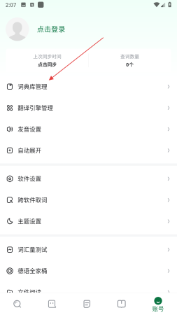 1、打开德语助手APP,在页面中找到并点击词典库管理选项,进入词典库管理页面。