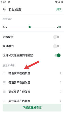 3、在发音设置的界面选择德语发音库,如德语女声在线发音。