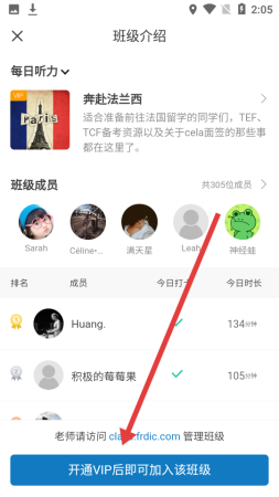 3、进入班级介绍页面,若该班级需要VIP权限,点击开通VIP后即可加入该班级,按提示开通VIP后即可加入,若班级无需VIP,直接点击加入班级按钮即可。