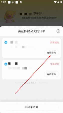 4、在弹出的请选择要咨询的订单界面中,找到对应订单并点击在线咨询。