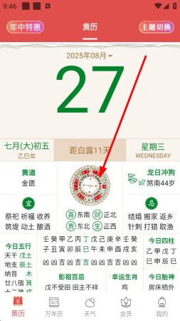 2、在黄历主界面中,能看到当日日期等基础信息,点击中间罗盘图标区域 。