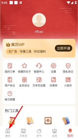 1、打开老黄历应用,进入我的页面,点击下方黄历按钮进入黄历主界面。