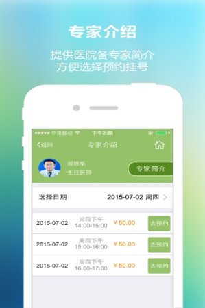 【挂号功能】提供本院全部科室普通门诊和专家门诊的预约挂号、实时挂号和实时叫号功能,患者只需一部手机,即可完成预约挂号并且可以随时随地查看叫号情况。