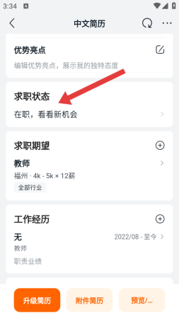 2、在中文简历的页面,点击求职状态的选项,弹出选择求职状态的窗口。