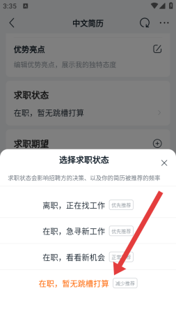 3、在窗口中选择在职,暂无跳槽打算,该状态会减少简历推荐曝光,达成求职状态的关闭效果。