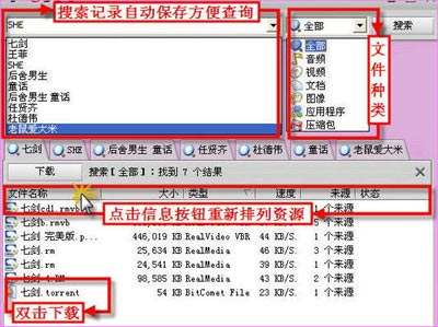第二步、找到资源。设置完成后,点击“确定”按钮返回软件主界面,点击“搜索”按钮,在“搜索”框中输入要搜索的资源的关键字,并在“文件类型”框中选择资源种类(Foxy将资源划分为多个类型,如音频、视频、文档等,选择相应的类型可以更快、更准确地搜索出相关资源),点击“搜索”按钮,稍候就能得出搜索结果(如图3)。搜索结果显示在窗口中,并能以文件的大小、类型、当前下载速度和可连接的资源数等方式排序,点击相应的信息栏按钮,可以按指定条件重新排列资源列表,方便初学的朋友在众多资源中快速找到合适的资源。