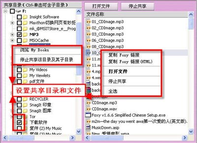 第四步、共享资源。“人人为我,我为人人”,把自已的资源贡献出来,才能得到更多的回报。点击主界面中的“共享”按钮,在“共享目录”栏中勾选共享的文件夹,重新启动Foxy后就可以在“文件名称”栏中看到共享目录中的文件了。如果不想把文件夹里的所有文件都共享出来,可以右击不想共享的文件,选择“停止共享”即可将它从共享文件列表中取消(如图5)。不过取消某个文件的共享是暂时的,下次启动Foxy时这个文件仍然会被共享出来。