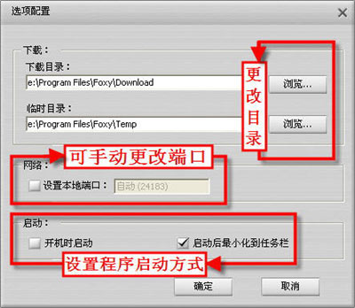 第一步、完成设置。点击界面右下角的齿轮状“设置”按钮,弹出“选项配置”面板,在“下载”栏中分别设置下载文件和临时文件存放的目录(默认路径为Foxy的安装目录),其它设置采用默认即可(如图2)。