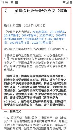 2、在登录界面,点击“注册”选项,进入注册协议查看页面,认真阅读菜鸟会员账号服务协议。
