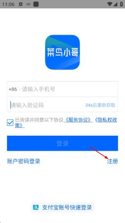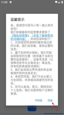 1、打开菜鸟小哥APP,在弹出的温馨提示框中,仔细阅读相关内容后,点击“同意”,进入登录界面。