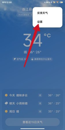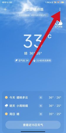 1、打开天气app进入主界面,点击屏幕右上角三点图标。