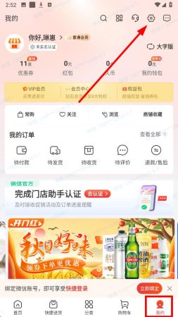1、打开易久批APP,点击底部导航栏中的我的选项进入个人页面,右上角,点击设置图标进入。