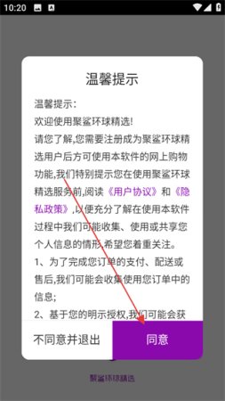 1、打开聚鲨环球精选APP,在弹出的温馨提示界面,点击同意。