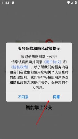 1、打开德州掌上公交,弹出服务条款和隐私政策提示,认真阅读相关内容后,点击“同意”按钮,进入应用主界面。