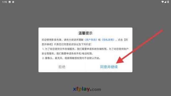 1、安装并打开影音先锋APP,弹出温馨提示窗口,阅读权限说明存储、电话权限用于文件存储、安全服务,点击同意并继续。