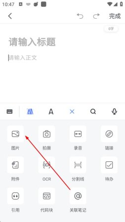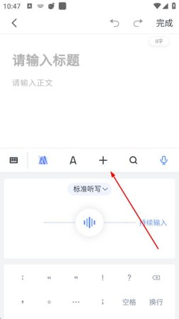 3、在新建笔记界面中,点击功能栏里的+号按钮,调出更多功能选项。