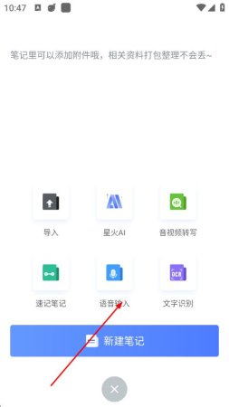 2、在弹出的选项中,点击语音输入图标,进入新建笔记界面。