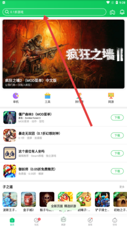 1、点击应用顶部搜索栏,输入游戏相关关键词,开启游戏查找流程,可搜索如疯狂之墙Ⅱ等游戏资源。