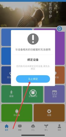 2、因账号未绑定设备时,系统会弹出功能无法使用提示框,点击蓝色的马上绑定按钮,这是激活设备功能的必要操作。